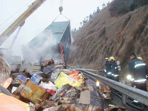 1月23日12时许,甬金高速金华往宁波方向112千米处(嵊州长乐段),一辆集装箱车在行驶过程中突然发生火情,市消防大队接到报警后紧急前往救援并以最快速度成功处置,避免了更大的损失。 市消防大队接到110调度中心命令后,迅速出动1台水罐消防车、7名指战员赶赴现场。到达现场后发现,一辆长达十多米的集装箱车停在高速道路一侧,集装箱车右边第二个轮胎正在燃烧,火苗四起,浓烟滚滚,火势正处于猛烈燃烧状态,并迅速朝着油箱和车厢货物蔓延。了解情况后,消防指挥员迅速组织高速交警设置了路障牌,封锁道路,并果断下令出一支水枪对火势进行控制,堵截火势向周围蔓延,同时利用开花水流冷却油箱,防止发生爆炸,造成更大的危险。 5分钟后,轮胎的火势得到控制,由于外围明火对集装箱箱体长时间的烘烤(箱底是木板材料),很快箱底被烧穿并引燃了集装箱内的服装,消防队员迅速打开集装箱后车门,将货物一件件搬出,并在火情得到初步控制后,佩戴好空气呼吸器深入内部灭火。由于扑救和冷却及时,车厢内温度不高,只有一些烟气,货物并无大的损失。 经过消防队员数小时的紧张扑救,到下午6时06分,明火全部被扑灭,堵塞的甬金高速(嵊州长乐段)也恢复了畅通。据集装箱车驾驶员介绍说,车厢内装载着的货物为服装,将近二十吨,价值四十多万元,正准备运到宁波北仑出口。