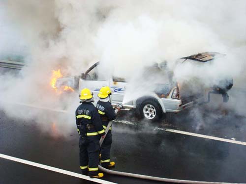 1月28日下午,一辆牌照为浙JoK1213的吉奥商务车从诸暨开往温岭,途经甬金高速金华往宁波方向92千米处时车头突然“冒火”,所幸嵊州市消防官兵及时赶到将“火魔”降服,保障了高速公路上车辆的行驶安全。 当天下午14时02分,市消防大队接到“110”指挥中心指令,位于甬金高速金华往宁波方向嵊州长乐段有一辆商务车起火,请立即前往扑救。接到指令后,大队迅速出动1台水罐消防车和7名指战员赶赴现场。当消防车行驶到距现场1千米的时候,就能清楚地看到前方上空烟雾缭绕,火光冲天,指挥员立即提醒大家,作好战斗准备,并要求做好个人防护。 到达现场后,只见牌照为浙JoK1213的吉奥商务车正在猛烈燃烧,火光照亮了半边天,炙热的火焰烘烤着油箱,若不及时处置,随时都有爆炸的危险。经过现场情况侦察,指挥员果断下达作战命令,战斗分成两组,一组战斗员出一支水枪从侧面对商务车发起“强攻”,二组战斗员出另一支水枪对油箱进行冷却,不到5分钟时间车外明火被扑灭。为彻底扑灭余火,消防官兵用撬棍把商务车引擎盖撑起,然后把水枪拉近再进行灭火。很快,余火被彻底扑灭,但商务车已被烧得面目全非,只剩下一个空架子。 事后笔者从驾驶员陈某处了解到,他开车从诸暨驶往温岭,不想车子开到此路段时车头突然起火,便立即靠边停车察看,由于车上没有随车灭火器,慌乱中他急忙报了火警。为此,笔者提醒广大司机朋友,要及时加强车辆的维护和保养,车上要配备随车灭火器,以防祸患。