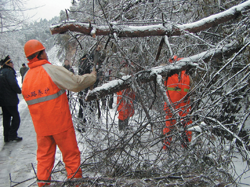 连日来的大雪压垮了一些公路边的树枝、毛竹。崇仁公路站的职工开着拖拉机到省道绍甘线清障,用砍刀和锯,锯断树枝,砍去竹梢,确保了公路的畅通。图为砍伐时的现场。