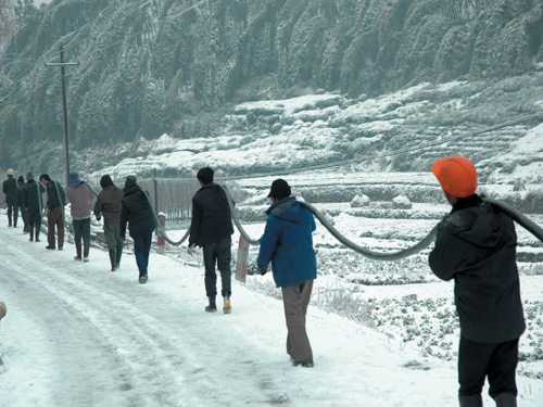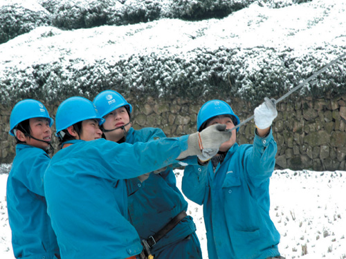 1月28日上午,因天气继续恶化,覆冰严重,绍兴电网输电线路冰灾事故范围进一步扩大,省送变电公司在500千伏桐凤线抢修施工过程中发生险情,因导线覆冰荷载过重,边相导线突然坠落掉地,桐凤线导线再次受损,同时也影响到嵊州市10千伏雅岗线,并造成雅璜乡原沿山、戴溪、上枝和下枝等5个村停电。 这可急坏了当地村民,特别是沿山村民周建良,当天晚上是他儿子的大喜之日。没有电,晚上漆黑一团该怎么办喜宴呢? 得悉这一情况后,市供电局领导特地赶至500千伏线路抗灾抢险驻嵊指挥部,与省送变电公司领导和专家探讨制定相关抢修方案。抢修方案确定暂时先由省送变电公司对500千伏桐凤线采取接地措施,对沿山等5个村进行临时供电,解决村民的燃眉之急;然后再在雅岗线上枝支线50至54号杆之间铺设500米电缆,确保5个村春节期间的正常用电。 1月29日,我市普降大雪,道路冰冻,覆冰严重,人员和车辆均无法上山,无法进行抢修施工。 1月30日早晨7时,大雪一停,市供电局立即组织40多人的抢修队伍,把500米电缆导线运送上山。送电的抢修队来了,消息传到沿山村,100多名村民自发地赶来帮忙,白雪皑皑的山道上,顿时一片热火朝天。与村民一起抬电缆的戴溪村干部张信良感慨道:介冷的天气,电力部门为我们送电,我们帮点忙是应该的。 不远处的雅岗线上枝支线35至36号杆之间,供电局的另一个施工点也在紧张有序地抢修被树木压断的导线。抢修人员踩着10厘米厚的积雪上山伐木,爬杆架线,他们不惧严寒顽强奋战的身影成为这个寒冷冬季的一道特别风景。 在抢修人员全力奋战下,500米电缆导线铺设工作顺利完成,到下午2:50,沿山村等5个村复电,人群一片欢腾。