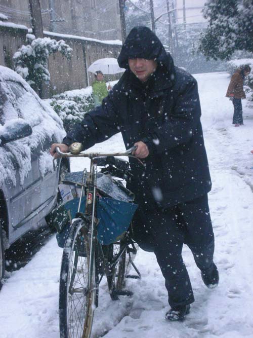 杜浙华送报的线路是越秀路、剧院路、官河路、北直街等,这几天的雨雪天,在有的上坡地段只能推着自行车艰难地前行,下坡时自行车的轮胎常常要打滑。 “这边雪太厚了,车子骑不进去,只能靠脚了。”杜浙华边跑边说。大约只用了十分钟,杜浙华就把手中的报纸投递到了剧院路一幢幢居民楼的信报箱中。 杜浙华说,他做投递员已24年了,这么多年来他从没请过一天假。10时50分,杜浙华结束了他上午的送报工作。一路下来,有不少市民用关爱的话语对杜浙华说:“这下雪天怎么还送报纸来,明天送也没有关系,以后这样的天气就不要送了。”每当这时,杜浙华激动地说:“接到报纸时的每一个微笑,对我就是最大的鼓舞”。