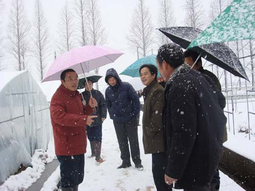 昨日,漫天大雪。农技大师和责任农技师纷纷冒雪深入田头地角,指导农民朋友做好抗雪防冻工作。 上午9时许,市农业局局长王益明带领蔬菜大师裘列群一行来到了黄泽镇白泥坎村。白泥坎村是全市有名的草莓专业村,今年该村种植了250亩大棚草莓。此时,几位村民正在扫掉草莓大棚上的积雪。技术人员详细询问了大棚草莓情况,向村民提出了抗雪防灾对策。 紧接着,农技人员又来到黄泽镇普安村的胡宅。胡宅是该镇蔬菜基地之一,有200亩大棚蔬菜。为确保大棚安全,蔬菜专业合作社负责人张湘华从2月1日晚上起,就组织人员对大棚进行除雪。见到蔬菜大师裘列群一行冒雪到田头了解灾情,张湘华紧紧握着裘列群的手说,“多亏了大师的指导,用了钢管大棚设施,蔬菜基地无一只大棚倒塌。”走进大棚内,裘列群向张湘华提出用烟熏等防冻措施来提高棚内温度,对于茄果类秧苗可采用多层覆盖保秧促生产。 时间不知不觉已近中午11时。雪花仍在飞舞,大棚内温暖如春,菜农们围着蔬菜大师讨教蔬菜抗雪防冻的技术要领。 在回城的途中,王益明局长接到了一景奶牛场的告急电话,他立即指示相关技术人员前往,自己也立刻赶赴现场指导。