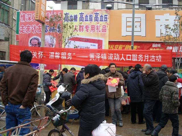 皑皑的白雪挡不住黄泽镇政府工作人员的服务热情!2月3日,镇人民政府、镇计划生育协会联合镇妇联、镇文化站在东直街举行了“以真情关怀,温馨服务”为主题的流动人口关爱活动。活动包括生殖保健、维权服务、十七大宣传、有奖知识问答、赠送春联、对联等;此次活动共吸引了近300名育龄群众参加,发放宣传资料200余份,赠送春联百余对;活动收到了良好的效果。