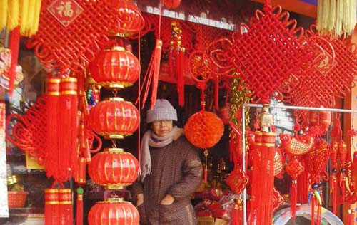 中国人过年总是离不开春联、门神和中国结。 天一放晴,张小惠就来到礼品店选购一些物品。小时候过年,门口贴的都是村里人自己写的对联,屋子里贴的都是财神爷之类的年画。 每个结饰都蕴涵着吉祥、如意、福禄等祝福含义。这两年城里人流行火红的中国结和春联。张小惠看人家贴着果然喜庆,今年她也想买一些回去。 中国结与另外的物件搭配,会有意想不到的修饰效果。一个编织成花朵模样的草花结下面配上长长的穗子,绑在扇子柄上形成别致的搭配;一串用三线吉祥结编成的“麦穗”挂在客厅里,代表着丰收,更添节日的喜庆气氛。张小惠就买了一个草花结和三线吉祥结,客厅挂一个,房间也挂一个。春联也要一对,寓意深刻一些的。店主人还推荐她再买一个“福”字,她也要了一个。 “过年嘛,总要把屋子装扮得喜气祥和些。”拎着一串挑选好的红红火火的中国结,张小惠的脸上满是过年的喜气。