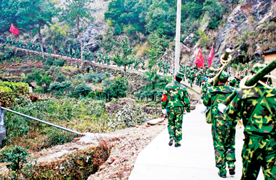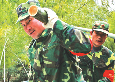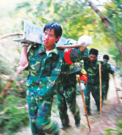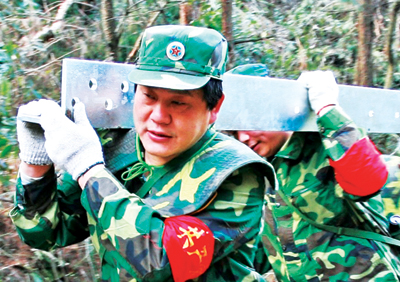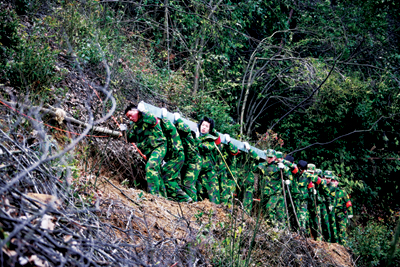 营长高毅力和三界镇人武部部长胡元金带头抢扛器材上山。
