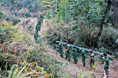 2月18日上午,官兵们到达抢险救灾现场,雨在不断地下着,山上的温度很低,有些地方甚至连积雪都没有融化。从千伏高压电塔铝材堆积地到目的地,一路都是陡坡,有些地方连山路也没有。但这样的困难并没有吓倒抗灾官兵,我市46名官兵在浙江某预备役师师长吴辉华、预备役营营长高毅力和三界镇人武部部长胡元金的带领下,立即投入到紧张的抢修工作之中。