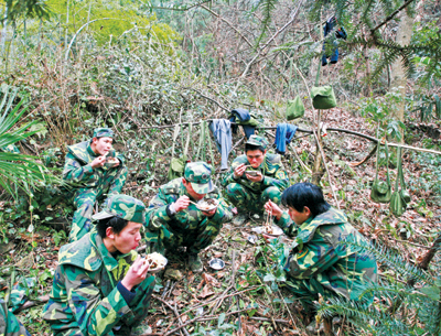 碰到张烨时,他刚洗完澡,拖着腿,走路摇摇摆摆的样子,战友跟他开玩笑:“张烨,怎么变‘卓别林’了?”张烨笑了笑,没有回答。 说起这次任务,张烨就有很多话要说:“我从小到大,真的从来没干过这么重的活。一百多斤重的东西,背在肩上就走,而且还是坡路。第一天回营,我觉得这两条腿简直就是别人的,因为走了很多陡坡,背了很多重东西,小腿和大腿都很痛,走路也像唐老鸭了,战友笑我像卓别林,其实他们也一样的,很多人腿上都贴满了药膏。我真想回家,可战友们都在干,我也不能当逃兵呀!” “这次是我第一次来金华武义,很想到城里去看看,但任务这么重,又这么累,就不能去了,只能以后有机会再来。”张烨告诉我们,“尽管这次抢险救灾任务很重很累,但我也很自豪,因为我坚持下来了,这对我来说是一个很有意义的回忆。”
