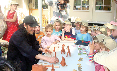 一次特殊的讲课 在马斯喀特市郊有一所贵族学校,名叫PDO SCHOOL(派特罗学校),已有50多年历史,是一所教学优质、设施上等的学校。这里汇集了300多个国家的儿童,从幼儿到初中不等年级,共有50多位老师。当校长得悉中国艺术家的到来,便马上去大使馆取得中国家长的姓名,并联系我们,请我们去学校作一次展示、表演。那天,校长派车接我们过去,并商定展演时间1小时半。 当我们用10分钟时间布置好场面,便马上聚集了许多人,孩子们专注的神情,令我们兴趣大增。当我们一剪刀剪出一朵花来,一捏捏出一个动物,孩子们更是乐不可支,他们请求老师:“能让我学学吗?” 于是,校长拍拍我的肩膀,对中国孩子的家长说:“可以请宓先生做我校的外籍老师吗?”经翻译后,我回答说:“这里没猪肉吃,先办了养猪场后再来!”直使他们哄堂大笑起来。 由于时间有限,我们匆匆与孩子们告别。临走时,他们用了刚刚学会的中国话说:“再见!” 我也朝他们挥挥手,可爱的小朋友,愿哪一天真的能用我的双手去教你们捏小泥人……