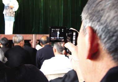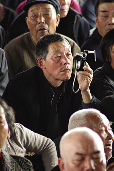 从演员出场到落下帷幕,王正法都“霸占”着戏台第一排的好位置,举着他的摄像机咔嚓咔嚓地拍摄。