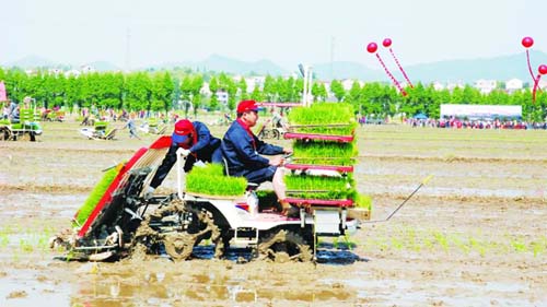 昨日,由省农技推广中心农机分中心和浙江农业吉尼斯委员会联合主办的“洋马杯”浙江农业吉尼斯水稻机械插秧擂台赛在我市三界镇三联村举行,来自全省各地的20家农机服务专业合作社参加了比赛。 每支代表队分高速插秧和步进式插秧两个组参加了角逐。结果,来自余姚市的临南农机服务队以13分19秒(平均每小时插秧9.01亩)插完两亩田的成绩,摘取高速插秧组桂冠,该记录创出了我省机械化插秧的最快纪录。来自余杭的丰和农机服务队以18分59秒插完一亩田的成绩夺得步进式插秧组冠军。 我省人多地少,稳定粮食生产必须依靠科技。从2006年开始,我省通过政策倾斜、项目扶持、考核配套等措施,大力推广水稻机械化插秧技术,到2007年,全省已推广水稻机械化插秧21.5万亩,今年全省计划推广40多万亩。近年来,我市的农机服务专业合作组织也得到了快速发展,到去年年底,全市已有农机总动力32.23万千瓦,培育出了12家规模较大、示范带动力强、能实施跨省区作业的农机专业合作组织。 省农业厅副厅长赵兴泉、杨晓彤,我市副市长郑法根参加了擂台赛开幕式。