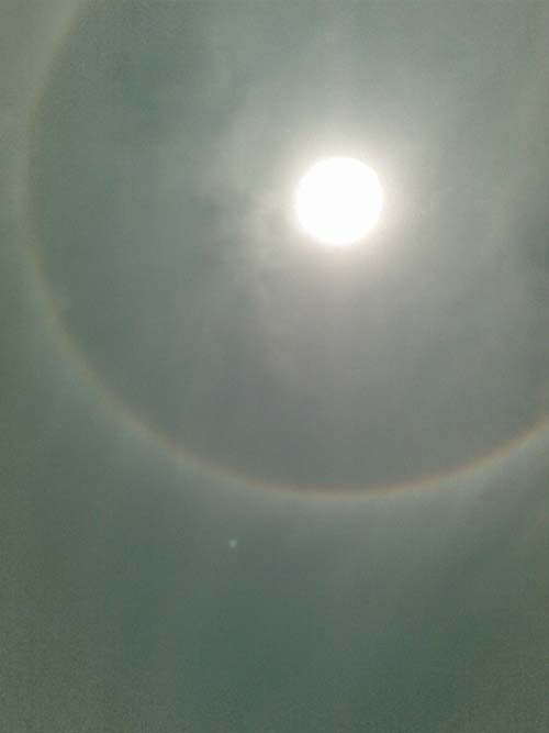 昨日中午,本市出现了非常完整的日晕。太阳被一圈类似彩虹的光环包围,内红外紫的日晕围绕在太阳周围,景象颇为壮观美丽。下午1时许,五彩光环逐渐散去。图为目击者用手机拍摄下的“日晕”画面。 相关链接:“日晕”是一种不太常见、但很正常的大气光学现象。“日晕”的发生取决于太阳的照射角度和云层,它是日光通过捲层云时,受到冰晶折射或反射而形成的。“卷云”要求距离地面1万米以上,云层中的温度在零下30℃左右,汇聚在云层中的小水滴被凝结成较大的颗粒状冰晶,如果此时太阳的照射角度恰好呈44度角时,就会出现“日晕”奇观。阳光透过天空中由冰晶构成的卷层云后,经过两次折射,分散成不同方向的各色光,往往在太阳周围出现一个或两个以上以太阳为中心、内红外紫的彩色光环,有时还会出现很多彩色或白色的光点和光弧,这些光环、光点和光弧统称为晕。