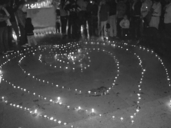 昨晚,市民纷纷自发来到市文化广场,点燃蜡烛,表达对四川汶川大地震死难者的哀悼。图为市民点亮心形灯寄托哀思。