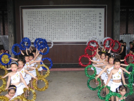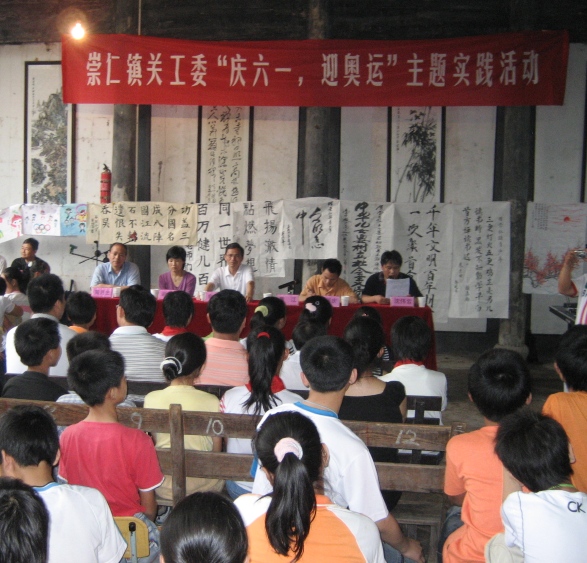 这次“庆六一、迎奥运”主题实践活动由崇仁镇关工委主办,崇仁镇相关领导与几十名学生欢聚一堂,共庆六一、同迎奥运。师生们用自己精心创作的字画装扮玉山公祠,用自己的歌声、舞蹈、诗歌、小品抒发自己的奥运情怀,迎接六一的到来。师生们精彩的表演博得了在场人员的阵阵掌声,使得古老的玉山公祠在奥运即将到来之际重新焕发新生。
