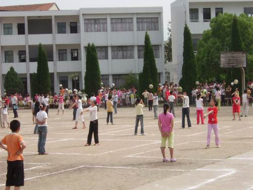 5月27日上午大课间时间,在黄泽镇校的操场上热闹非凡,全校1200多名师生围在操场四周,观看这场“庆‘六一’迎奥运”排球垫球比赛。