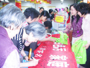 昨日上午,市妇联与三江购物嵊州分公司联合举行了“拒绝白色污染家庭行动”,活动现场还向市民发放了环保购物袋。一位姓王的中年女士告诉记者,她已经作好了不用塑料袋的准备,除了刚刚领到的环保袋之外,她还用棉布缝制了4个购物袋。