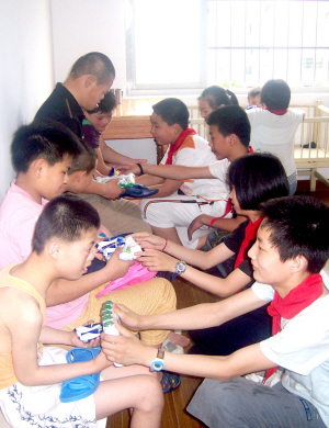 在我市有一群特殊的孩子,他们身患疾病,从小被父母遗弃,他们往往不为人所知,但渴望得到社会关注。图为5月28日,一群来自育英小学的学生带着礼物和关爱,前往阳光山庄看望那里的残疾孤儿。