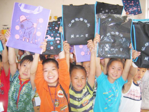 今年的“六一”是“限塑令”开始实施的第一天,城北小学开展了“携手1+6”活动,向每位学生赠送了一份特殊的“六一”礼物——环保购物袋,并且发放了环保倡议书,号召孩子以一个人的力量带动“爸爸、妈妈、爷爷、奶奶、外公、外婆”六个人的力量,加入到拒绝“白色污染”、倡导使用环保袋的行列中来。图为学生背着环保袋在学校参加“六一”环保活动。