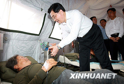 5月31日,中共中央总书记、国家主席、中央军委主席胡锦涛前往陕西地震重灾区汉中市,察看灾情,指导抗震救灾工作。这是胡锦涛在宁强县广坪镇金山寺村,看望正在救灾帐篷内接受治疗的受伤村民。 新华社记者鞠鹏摄