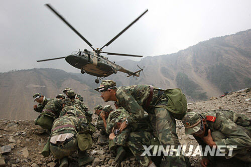 震后第21分钟,成都军区派出查看灾情的4架直升机起飞。驻灾区的成都军区6100名官兵和武警四川总队3000余名官兵紧急出征,采取多种办法南北并进开赴救灾一线。