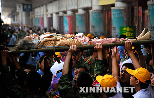 5月21日,在西安火车站,第四军医大学的医护人员和青年志愿者一起运送重伤员。当日6时58分,载着来自四川重灾区248名伤员的专列停靠在西安火车站,这批伤员被迅速转运到第四军医大学所属的西京医院和唐都医院。这是四川汶川大地震后被送往陕西省进行救治的首批重伤员。 新华社发(祁小军 摄)