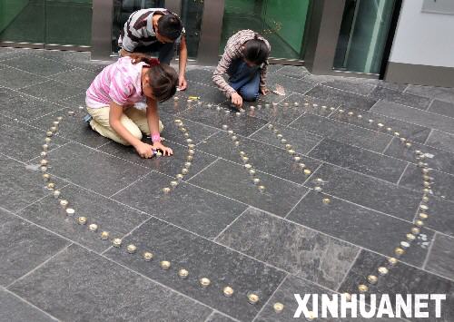 5月22日,在德国法兰克福的募捐活动现场,人们用蜡烛摆出心的形状和“川”字。当天,德国川渝同乡会、同济校友会等26个华人团体在法兰克福举行为中国汶川地震灾区捐款活动。 新华社记者郇公弟摄