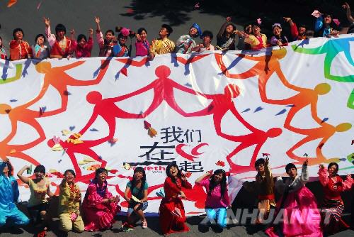 5月30日,中央民族大学学生身着民族服装,在校园展示一幅为灾区儿童创作的巨幅海报,并放飞写满祝福的纸飞机。这幅海报长达10米,由参加“2008我们在一起”全球华人设计师抗震救灾公益海报设计征集活动的华人设计师联手中央民族大学美术学院师生设计。新华社记者王建华摄