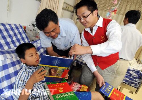 5月30日,来自四川地震灾区的10岁男孩邓俊涛收到杭州慈善总会捐赠的少儿书籍。 当日,杭州各界爱心人士将捐赠的各类儿童节礼物,送给四川地震灾区转移来杭州治疗的受伤儿童,祝愿他们早日康复,并度过一个快乐的儿童节。 新华社记者 王定昶 摄