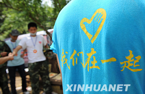 5月22日,身穿写有“我们在一起”字样T恤的志愿者活跃在四川省青川县孔溪乡。四川汶川地震发生后,来自全国各地各行各业的志愿者纷纷赶到地震灾区,伸出援手为灾区群众排忧解难,奉献爱心。 新华社记者 蔺以光 摄