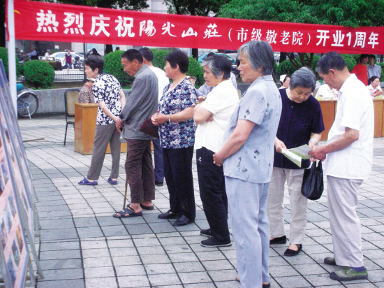 为纪念阳光山庄开业一周年,5月30日,阳光山庄的工作人员在中心广场举行了宣传咨询活动,活动现场,阳光山庄的四位入住老人担当了导游,介绍了他们心目中的阳光山庄,吸引了众多市民的眼球。