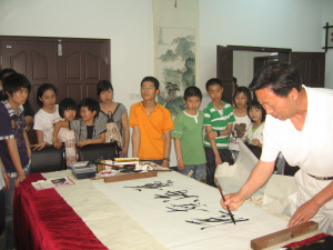 为丰富当地群众的文化生活,长乐镇文联近日在镇文化活动中心举行“迎奥运书画创作”现场会,七位书画大师泼墨挥毫,吸引了该镇学生争相观摩。