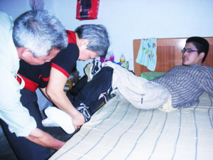 2004年,邓联播被查出患有强直性脊柱炎,去年1月,他的左脚已无法行走,右脚也动弹不得,近乎瘫痪,为此,他不得不告别心爱的大学校园,辗转京城、省城四处求医。