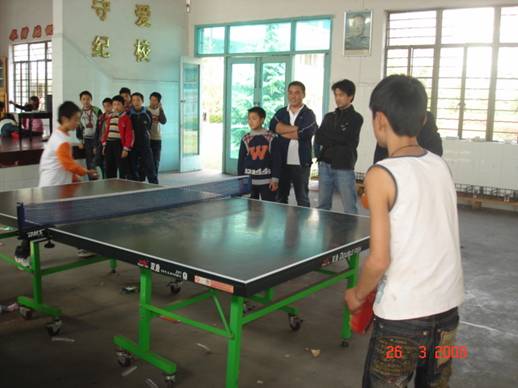 乒乓球是蛟镇小学的传统体育项目,学校为了发展乒乓球项目,新购置乒乓球桌四套,成立校乒乓球队,有专门的男女学生教练每天为队员们进行训练,为使更多的学生参与到乒乓球活动中来,学校每学期举行一次乒乓球比赛,图为近日正在进行的每班三男两女参加的“乒乒乓乓”喜迎奥运乒乓球团体赛。