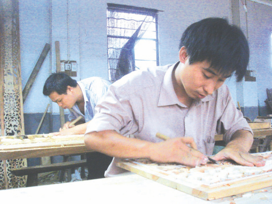 近日,来自杭州的一位企业家以3万元的高价买走了一幅嵊州市翔宏工艺木雕厂的“百子图”,另外又预订了两幅“百子图”。据厂长杨柏松介绍,自从我市被命名为“中国根艺之乡”后,全市的根艺、木雕产业红火了很多,今年以来,工厂的订单不断。图为该厂的专业人员正在认真雕刻木雕产品。