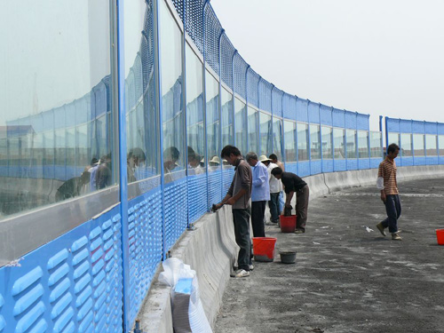 双塔大桥横跨城东工业区与市区之间,是我市重点建设工程之一,目前大桥两侧已经开始安装蓝色的隔音护栏,一眼望去非常醒目靓丽。据了解,等护栏安装成品全部到位后,护栏安装工作近期即可完工。图为工人顶着烈日在对部分安装完的护栏底部进行水泥勾缝。