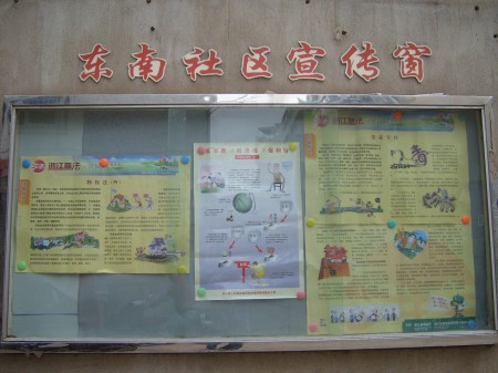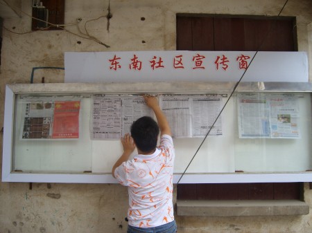 社区宣传栏是为居民提供最新资讯的信息窗口,是小区里的宣传阵地,正是认识到社区信息宣传的重要性,东南社区在这方面投入了持续的精力。在街道和社区领导的重视下,社区对信息宣传工作做了系统的规划,成立了专门的组织、建立了相关制度、配置了专门的人员来负责和维护社区的信息宣传工作。在前期投入3万余元在长阳路建成长15.2米的科普文化长廊,定期更新科普知识、生活保健、计生常识等群众日常生活中常用知识的基础上,再次筹资在东南路219号、南桥路各建立宣传阅报栏一个,并由社区工作人员每隔一天便对报纸和信息进行更新,使社区居民能够及时了解国家大事,了解党和政府的各项方针政策。在此基础上,社区还定期对辖区内的几块黑板报进行更新,居民往往能从这里得到他们需要的各种信息。同时,社区还在各楼幢的醒目位置、各单元口钉有一块便民牌,上面除了有各种常用的电话号码如火警119、急救120外,还留有一块空白的空间,这也是社区宣传信息的一块有效阵地,社区每每有紧急事情需要通知大家,往往通过各楼幢长在此空白处写上信息,如“台风来临,请大家及时收回阳台上的花盆等重物” 、“晚上社区有文艺汇演,请有兴趣的居民前来社区观看”等等。通过这一形式,社区楼道不仅仅是居民出入的过道,更成为互通邻里、联系社区与居民的通道、暖心道。