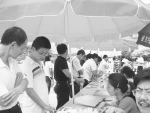 6月21日,市职技校、职教中心、体育学校和越剧艺校等全市10家职业学校在市文化广场举行了招生宣传、才艺展示和志愿服务活动。图为在市职技校摊位前,一位家长带着儿子正在咨询相关专业的情况。