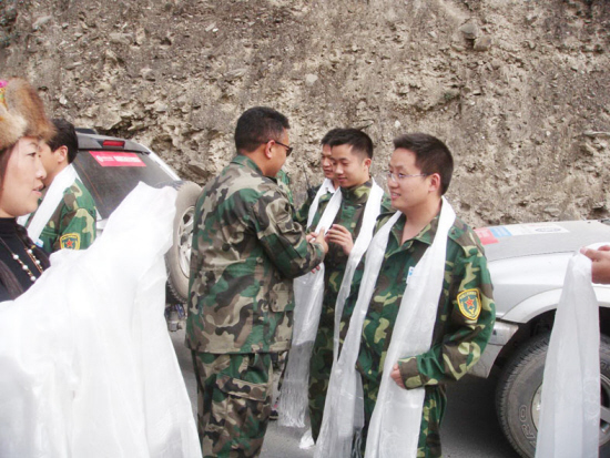 修复了基站,藏区人民为梁华他们献上了哈达 |