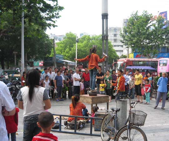 近日,在嵊州市区最繁华的国商大厦门前,有四个卖艺的小女孩在街头进行杂耍表演,一些简单的道具成了他们谋生的手段,吸引了不少市民围观并“慷慨解囊”,同时也造成了这个地段的交通拥堵。后来在城管和保安的制止下,她们才结束了这场街头表演。