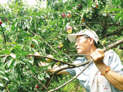 醉李是我省稀有的李中珍品,在古代曾作为皇家的“贡品”。金庭镇果农大户王裕生10年前在陈公岭山坡上引种醉李,经过科学管理,精心培育,今年获得丰收,60余棵醉李总产量可达150余公斤。图为王裕生正在采摘醉李。