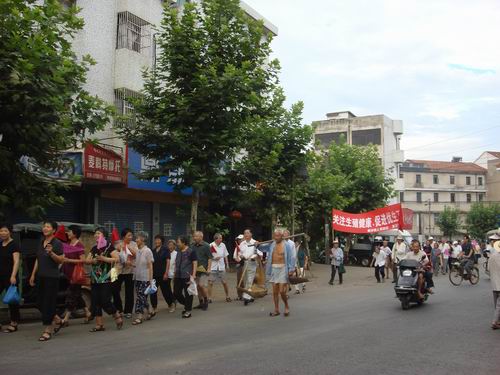 在第19个世界人口日到来之际,由黄泽镇计生协会、老年协会组织的世界人口宣传日活动在该镇举行。这天上午一大早,一支不少于300人的宣传队伍,在“迎奥运,健康我先行,关注生殖健康,促进优生工程”的主题横幅引领下,由300多人组成的全镇热心于计生宣传的老年朋友开展了健康走活动,宣传队伍首先在由30多人组成的服饰统一的军乐队、腰鼓队开路下,老人们精神抖擞分成二路纵队,从老年活动室出发途经东直街、黄泽大桥、镇中心卫生院直至白泥坎村,黄泽镇老年协会将第19个世界人口日宣传活动与老人迎奥运健康走的形式很好地结合起来,此次活动收到了较好的效果。
