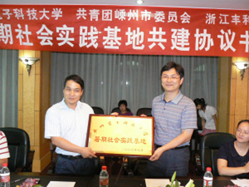 在团市委的牵线搭桥下,7月12日,杭州电子科技大学与浙江丰利粉碎设备有限公司举行了暑期社会实践基地共建协议书签约仪式。图为“杭电”管理学院党委副书记高军和“丰利”董事长余绍火共同为基地授牌。(袁华东 摄)