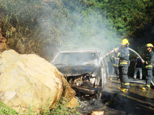 据驾驶员陈师傅介绍,当时他驾车行驶至该路段时,只见一辆摩托车飞快地开过来,为防止与其发生碰撞,陈师傅向右猛打方向盘,由于没有把握好方向盘,车子一头撞上了路边的山体岩石。就在陈师傅下车察看情况时,车头突然蹿出一股火苗,火势迅速蔓延开来,由于车上没有随车灭火器,慌乱中陈师傅急忙报了火警。