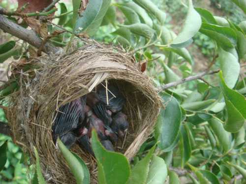午后信步去里南乡政府办公楼后山里的梅园,惊喜地发现梅树上的鸟巢里不仅有美丽的鸟蛋,而且孵起了可爱的小鸟宝宝!真是难得一见!