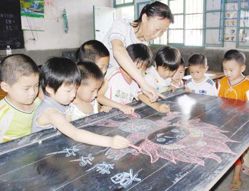 近日,谷来镇马溪村的一名退休女教师正带着该村的留守儿童在简陋的黑板上画“奥运福娃”。马溪村与绍兴的王坛交界,每年夏季村里的壮劳力全部外出打工挣钱,该村专门从办公楼里整理出一间空房,请退休教师来辅导村子里的留守儿童,使他们过一个安全而有意义的暑假。(张亮宗 摄)