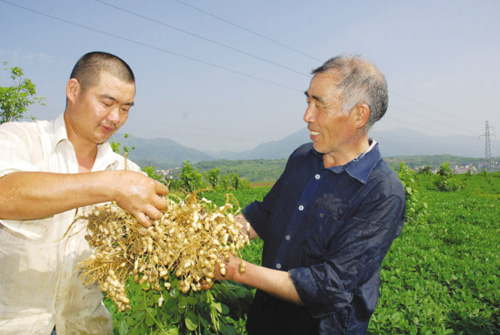 剡湖街道市开口乐果蔬专业合作社采用“荒地战略”,使300多亩荒坡地资源得到科学开发,逐步产生了经济效益。目前试种的70余亩山坡荒地上花生、玉米、菜豆、西瓜等蔬菜瓜果长势良好丰收在望。图为社员正在采收西瓜和花生。