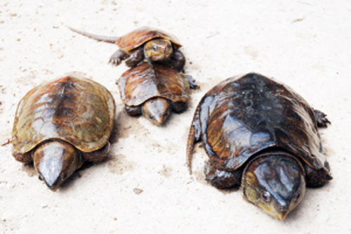 笔者闻讯后赶到现场,见4只龟一大、一中、两小,像是一个家族。最大的一只浑身黑色,重约一公斤左右,拖着15厘米左右的尾巴,嘴里不停地发出“呼呼”的声音,其它3只带有一些黄褐色。