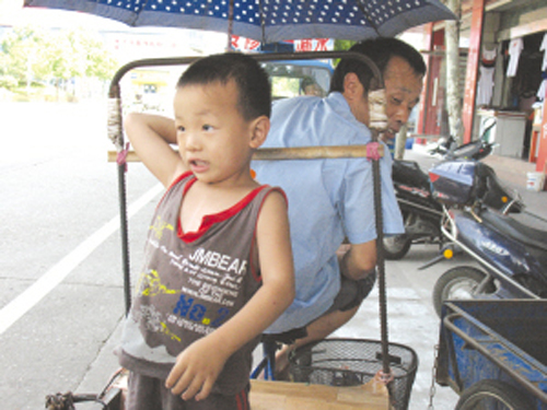 不得不带着孩子一起出来。为了不让儿子晒到太阳,他在三轮车上拴了一把撑开的伞,让儿子躲在伞的阴影里。