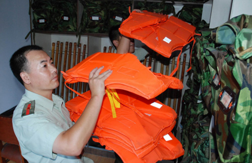 为抗击台风“凤凰”,昨日下午,市人武部进行部署,要求各基层人武部和民兵预役备役部队做好抗台物资和人员的准备。图为昨日剡湖街道人武部在清点抗台物资。