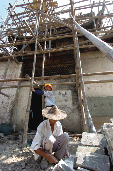 村民们嘀咕着,议论着。脚手架搭好时,已是傍晚,五六位村民七手八脚地爬到了止水亭顶层。左一锹、右一棒,墙体很快被打开了。