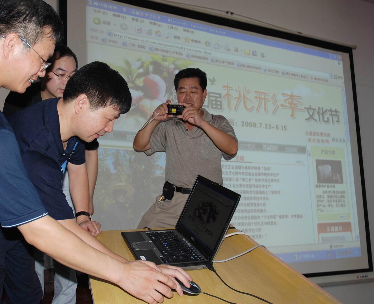 现在桃形李上市进入旺季,为了拓展销售渠道,嵊州新闻网与金庭镇党委政府联合推出第二届桃形李文化节专题网页,通过嵊州新闻网及浙江在线所属的各县市新闻网站,推介“羲之牌”桃形李,同时将一大批桃形李大户的名片上网,使消费者可以通过网络与桃形李大户取得联系。图为7月25日上午9:30开通点击仪式。